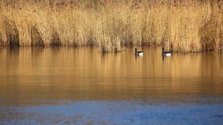 Keywords: lake reed birds bank pond nature mirroring idyll lakeside beautiful waters mood water sun geese wild geese