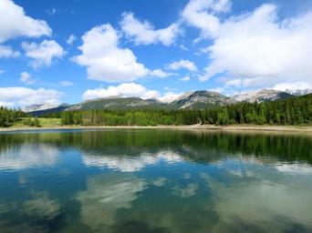 Keywords: lake reflection on lake sunny water sky reflection landscape nature blue park scenery calm forest natural summer wilderness scenic canada outdoor tranquil mountain