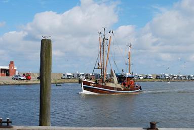 Keywords: lake sea port harlesiel fishing boat gull bollard mobile homes sky clouds water