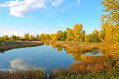Keywords: lake trees fall gold nature landscape forest river water background sunny
