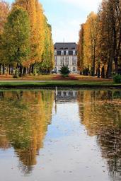 Keywords: lake water pond animal bird heron avenue trees autumn mirroring building home