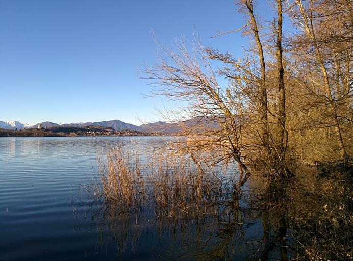 Keywords: lake water shrubs trees rovi sky mountains skyline comabbio riva waves italy lombardy reflections
