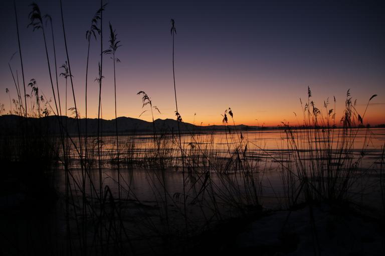 Keywords: lake winter evening sunset ice cold water mountains bank