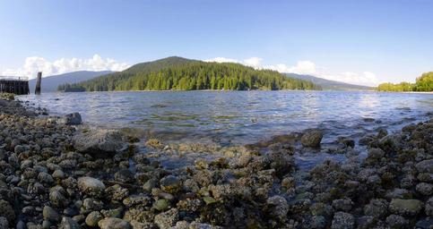 Keywords: lakes water rocks gray grey stones riverside riverbank green flora plants trees nature blue sky outdoors scenic scenery landscapes natural environment bright day peaceful calm