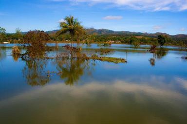 Keywords: lakes water trees blue sky landscapes scenic scenery reflective surfaces reflections colorful hills horizon nature flora vegetation greenery plants palms coconut trees