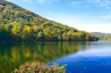 Keywords: lakeside fall mountains hillside water blue sky reflection clear skies nature outdoors royalty free