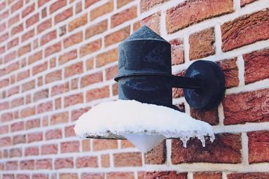 Keywords: lamp outdoor light snow covered snowy winter cold white wintry close icy icicle wall masonry brick bricks red stone wall brick wall structure stone building bricked rau facade home house wall