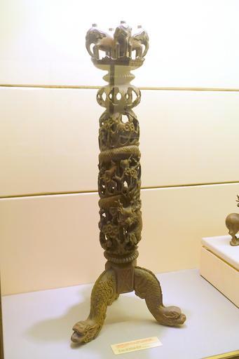 | Keywords: Lamp stand with elephant, dragon, apricot, and lotus motifs, for ritual use, early 20th century, carved wood - National Museum of Vietnamese History - Hanoi, Vietnam - DSC05570.JPG en Exhibit in the National Museum of Vietnamese History Hanoi Vietnam Photography was permitted in the museum without restriction This artwork is old enough so that it is in the public domain 2014-08-06 03 18 21 own Daderot other versions cc-zero Wood carving in the National Museum of Vietnamese History Uploaded with UploadWizard |