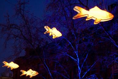 Keywords: lamps lighting fish night orange blue light lights colorful atmosphere trees yellow dark lichtspiel seem installation color objects