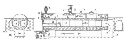 | Keywords: Lancashire boiler, section (Bentley, Sketches of Engine and Machine Details).jpg The Lancashire boiler usually varies from 5'6 diameter up to 8'6 diameter and from 15 feet to 30 feet in length The Cornish boiler is similar but with one central furnace instead of two Cornish boilers range from 4' to 7' diameter and from 10 feet to 30 feet in length - 1 Fusible plug - 2 Water level gauge - 3 Steam pressure gauge - 4 Dead weight safety valve - 5 Main stop valve - 6 Steam collecting pipe - 7 High and Low Water Safety Valve - 8 Manhole - 9 Gusset stay - 10 Adamson's Rings - 11 Firebars - 12 Blow-off Cock - 13 Furnaces - 14 Flues - 15 Brickwork 107 Lancashire boilers |