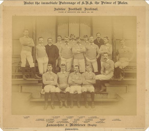 | Keywords: Lancashire county rugby team 1887.jpg Lancashire County rugby union team that played Middlesex County at the Jubilee Football Festival 12 March 1887 Back row V J Slater Salford A H Stockley Liverpool A T Kemble Liverpool J W Roberts Salford R Walker Vice-President L C F C <br>Middle row J Robertson Boughton Rangers A N Hornby President L C F C S Roberts Swinton F S Ross Broughton C Anderton Free Wanderers H Eagles Salford R Seddon Broughton Rangers Front row H C Chapman Old Boys J H Payne Captain Cambridge University and Broughton J Mills Swinton J Valentine Swinton A Teggin Broughton Rangers 1887-03-12 Downloaded from https //www flickr com/photos/rugby_pioneers/9442118927/ Scanned by Frederic Humbert E Hawkin Co -- Probably Eliza Hawkins ca 1828-1887 but maybe George Thatcher 1839- See http //photohistory-sussex co uk/LancingPhotgrs htm Cropped version at File Lancashire county rugby team 1887 cropped jpg other versions PD-old-70-1923 Uploaded with UploadWizard 1887 in rugby union Lancashire County Rugby Football Union ImageNote 1 3225 1046 548 1180 4150 3648 2 Robert Seddon ImageNoteEnd 1 ImageNote 2 1838 918 347 274 4150 3648 2 Arthur Kemble ImageNoteEnd 2 ImageNote 3 1673 985 359 371 4150 3648 2 Samuel Roberts ImageNoteEnd 3 ImageNote 4 2787 1021 383 444 4150 3648 2 Harry Eagles ImageNoteEnd 4 ImageNote 5 1533 1745 481 900 4150 3648 2 John Payne ImageNoteEnd 5 ImageNote 6 1905 1806 432 748 4150 3648 2 Joe Mills ImageNoteEnd 6 ImageNote 7 2270 1745 432 784 4150 3648 2 James Valentine ImageNoteEnd 7 ImageNote 8 2702 1459 542 863 4150 3648 2 Alfred Teggin ImageNoteEnd 8 |