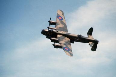 | Keywords: Lancaster B1 PA474 28 May 1988.jpg A Royal Air Force Avro Lancaster B Mk I serial number PA474 in flight during Air Fete'88 a NATO aircraft display hosted by the U S Air Force's 513th Airborne Command and Control Wing at RAF Mildenhall Suffolk UK PA474 is one of only two Lancasters remaining in airworthy condition out of the 7377 that were built “ the other being in Canada She was built in Chester in mid-1945 and was earmarked for the Tiger Force in the Far East However the war with Japan ended before she could take part in any hostilities She was therefore assigned to Photographic Reconnaissance duties with 82 Squadron RAF in East and South Africa While operating with 82 Squadron PA474 had her turrets removed In 1964 she was adopted by the Air Historical Branch RAF for future display in the proposed RAF Museum at Hendon Since 2007 PA474 wears the markings of EE139 the Phantom of the Ruhr ' that flew her first 30 strikes with No 100 Squadron based at Waltham before completing a further 91 operations with No 550 Squadron at North Killingholme She sports the letters HR-W of The Ton on her port side and BQ-B of 550 on her starboard commemorating the crews of both squadrons U S Defense Visual Information Center photo DF-ST-89-00307 http //www dodmedia osd mil/ 1988-05-28 USAF PD-USGov Avro Lancaster PA474 No 550 Squadron RAF No 82 Squadron RAF RAF Mildenhall Air Fete 1988 Photographs taken on 1988-05-28 |