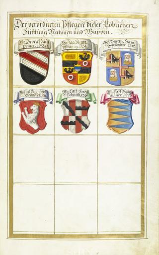 | Keywords: Landauer II 006 r.jpg Wappen der Pfleger der Landauerschen Zwölfbrüderstiftung Georg Paul Pömer 1720 Sigm und Pfintzing 1724 Burckh ard Sig mund Holtzhuher 1737 Carl Sigm und Ferd inand Grundherr 1744 Carl Friedr ich Behaim 1758 Carl Wilhelm Ebner 1776 Transkription und weitere Informationen siehe http //www nuernberger-hausbuecher de/75-Amb-2-279b-6-r/data Hausbuch der Landauerschen Zwölfbrüderstiftung Band 2 Nürnberg 1708 “1806 Stadtbibliothek Nürnberg 279b 2° via http //www nuernberger-hausbuecher de/ 1708 “1806 anonymous PD-old-100 Hausbuch der Landauerschen Zwölfbrüderstiftung Band 2 Coats of arms in the Zwölfbrüderbücher Supervisors in the Zwölfbrüderbücher Coats of arms of Ebner von Eschenbach family |