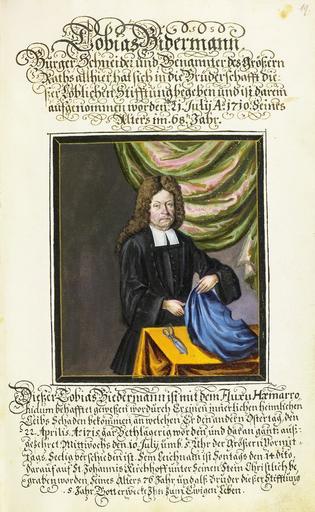| Keywords: Landauer II 019 r.jpg Transkription und weitere Informationen siehe http //www nuernberger-hausbuecher de/75-Amb-2-279b-19-r/data Tobias Bidermann; Biedermann Biedermann Schneider Hausbuch der Landauerschen Zwölfbrüderstiftung Band 2 Nürnberg 1708 “1806 Stadtbibliothek Nürnberg 279b 2° via http //www nuernberger-hausbuecher de/ 1710 anonymous PD-old-100 Hausbuch der Landauerschen Zwölfbrüderstiftung Band 2 Tailors in art | ||||