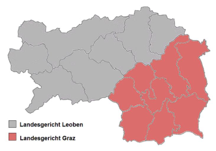 | Keywords: Landesgerichte Steiermark.svg Gerichtsbezirke in der Steiermark Stand 2012 Dargestellt ist die Zugehörigkeit zum Landesgericht Leoben bzw Graz eigenes Werk unter Verwendung von Gemeinden Steiermark svg 2011-04-17 Geiserich77 Courts of Styria Cc-zero |