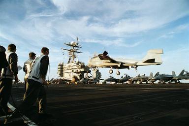 | Keywords: 020101-N-6119T-001 EA-6B traps on the flight deck.jpg en 020101-N-6119T-001 At sea aboard USS Theodore Roosevelt CVN 71 Dec 31 2001 -- An EA-6B Prowler from the Rooks of Tactical Electronic Warfare Squadron One Three Seven VAQ-137 passes between the Landing Signal Officers LSO's and Theodore Roosevelt's island structure as it lands on the flight deck The Rooks are part of Carrier Air Wing One CVW-1 and deployed with the aircraft carrier in support of Operation Enduring Freedom U S Navy photo by Chief Photographer's Mate Dennis D Taylor RELEASED 2001-12-31 020101-N-6119T-001 Navy http //www navy mil/view_image asp id 334 U S Navy photo by Chief Photographer's Mate Dennis D Taylor PD-USGov-Military-Navy December 2001 photographs Photographs taken on 2001-12-31 December 2001 in the United States Grumman EA-6 Prowler USS Theodore Roosevelt CVN-71 flight deck Aircraft carrier landings Military people in 2001 Men at work Military people on duty |