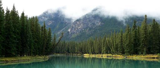 Keywords: landscape bow river alberta canada banff mountains scenic nature forest scenery trees clouds mist haze reflection