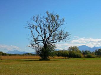 Keywords: landscape chiemsee upper bavaria tree mountains meadow distant sky clouds mountain blue mood autumn