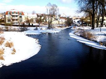 Keywords: landscape city cities winter snow ice buildings architecture stream river water nature outside blue colorful vibrant beautiful