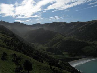 Keywords: landscape flea bay akaroa peninsula new zealand mountains green fields scenery water lake beach sea