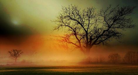 Keywords: landscape fog scenic colorful sky trees orange sun dusk evening twilight meadow rays mist haze crepuscular outdoors nature