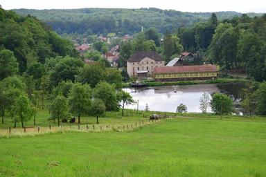 Keywords: landscape gondola pond forest nature thuringia germany pond water meadow village green