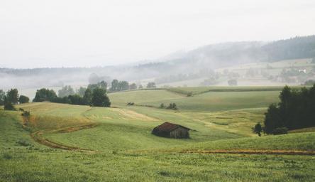 Keywords: landscape hills rural countryside hut shed agricultural meadows grassland grass vegetation trees idyllic foggy misty fields outdoor nature