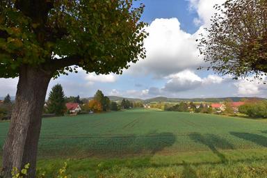 Keywords: landscape meadow cows nature field grass green sky forest yellow sun horizon blue arable tree