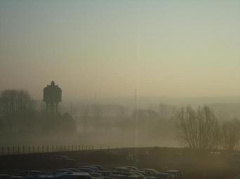 Keywords: landscape morning trees water tower fog