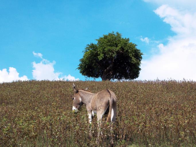 Keywords: landscape mountains fields white donkey animal sky clouds