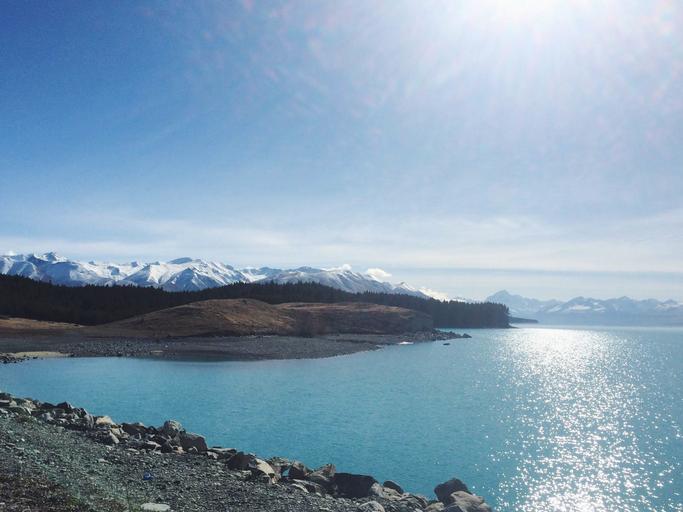 Keywords: landscape mountains peaks hills snow trees forest lake water sand rocks pebbles sunshine blue sky nature