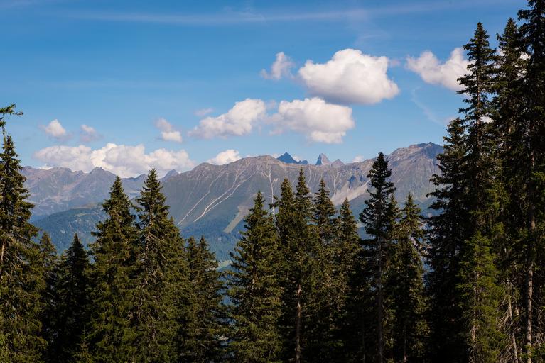 Keywords: landscape mountains view outlook trees conifers sky clouds nature tyrol austria summer