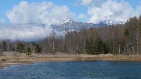 Keywords: landscape nature pond mountain alps spring water trees sky clouds