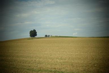 Keywords: landscape nature tree hill wide summer harvested harvested grain field sky clouds peaceful distant horizon