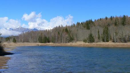Keywords: landscape nature water pond forest sky blue clouds alps mountain spring