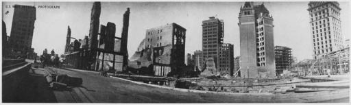 | Keywords: Landscape photograph of San Francisco during the Earthquake and Fire of 1906 - NARA - 296859.tif Scope and content This is a wide angle view Full caption Street -level view looking west At the intersection of Fourth and Market Street with Fourth in the foreground At the extreme right is the Speckels Buildging The Call Building on the extreme right of the view Facing it is the Mutual Saving Bank Both of these buildings were rebuilt and still stand today General notes This photograph was most likely printed in the 1950s 296859 Local identifier Department of Defense Department of the Navy Mare Island Naval Shipyard Office of the Commander Office of the Shipyard Historian 1976 - ca 1996 NARA's Pacific Region San Bruno NRHAS 1000 Commodore Drive San Bruno CA 94066-2350 04/1906 Record group Record Group 181 Records of Naval Districts and Shore Establishments 1784 - 2000 Record group ARC 510 Subject Files compiled 1976 - 1996 documenting the period ca 1854 - ca 1996 Series ARC 296821 File unit Earthquake 1906 1 of 2 1906 - ca 1980 File unit ARC 296854 Variant control numbers NAIL Control Number NRHS-181-MINSYHISTSUBJ-EQ1906 1 -5<br /> Other Identifier NY9-28410-3-56 yes Other versions NARA images of California - NARA-cooperation PD-USGov San Francisco earthquake of 1906 Buildings damaged by earthquakes 1906 NARA images of San Francisco County California Black and white photographs of San Francisco Earthquake Panoramics of San Francisco |