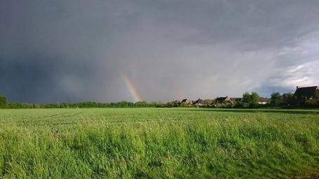 Keywords: landscape rainbow view nature threatening sky air green summer farm pasture dark air grass heaven colors background