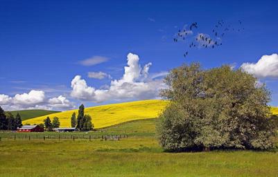 | Keywords: landscape rural farm field nature countryside green spring tree summer meadow scenery agriculture agricultural land sunlight sunny growth sky outdoors season light country scenic hill scene farmland weather pasture grass blue environment cloudy sky flock birds freedom |