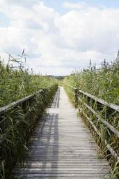 Keywords: landscape spring lake nature reserve nature moorland wetland summer grasses reed silted nature conservation southern germany sky clouds summer landscape baden württemberg far web bridge boardwalk wooden planks wooden boards away