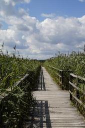 Keywords: landscape spring lake nature reserve nature moorland wetland summer grasses reed silted nature conservation southern germany sky clouds summer landscape baden württemberg far web bridge boardwalk wooden planks wooden boards away