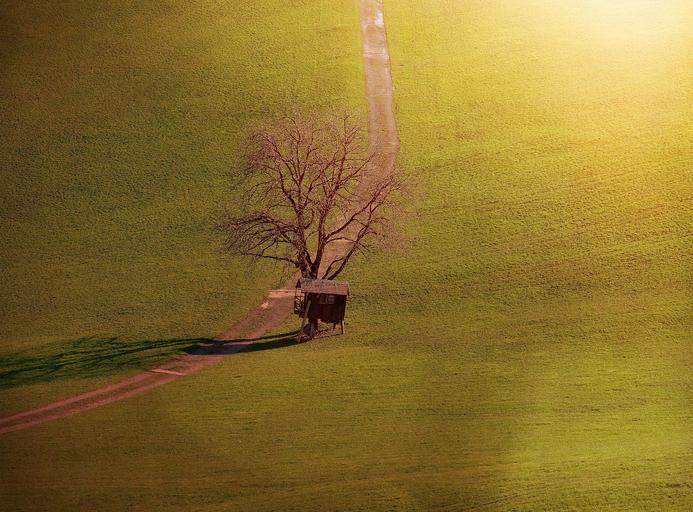 Keywords: landscape tree hut away meadow nature lonely sunlight lighting