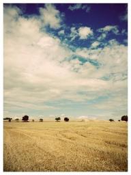 Keywords: landscape trees fields straw sky blue yellow wide clouds germany hesse