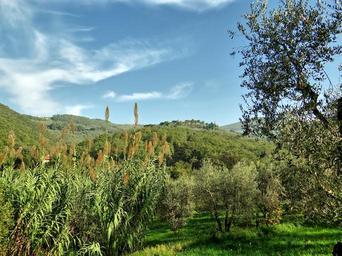 Keywords: landscape tuscany olive tree mountains sky clouds idyll view