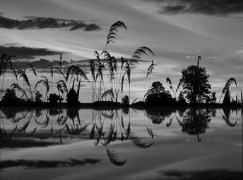 Keywords: landscape water reed nature lake river nature reserve grass clouds sky waters black and white mirroring quiet relaxation silent beach bank sea summer idyllic calm mood aquatic plants idyll reflection horizon