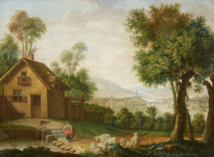 | Keywords: Landschaft mit Bauernhaus und Blick auf eine Stadt am Fluss 18Jh.jpg Landschaft mit Bauernhaus und Blick auf eine Stadt am Fluss Deutscher Meister der 2 Hälfte des 18 Jahrhunderts Öl auf Leinwand 73 x 99 5 cm https //www lempertz com century 18 anonymous PD-100 Images from Kunsthaus Lempertz Landscape paintings of Germany Shepherds in art | ||||
