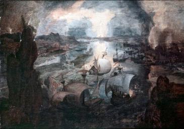 | Keywords: Landschaft mit Segelschiffen und einer brennenden Stadt.jpg Artwork de Landschaft mit Segelschiffen und einer brennenden Stadt / Landschaft mit Segelschiffen und brennender Stadt ~ 1552/53 Aufnahmedatum 1956 oil on wood 24 4 x 34 8 Dortmund ehem Sammlung Becker http //www bildindex de/obj00077259 html unklar möglicherweise Pieter Bruegel der Ältere<ref>Alexander Wied Verzeichnis der Gemälde Pieter Bruegels d Ä S 155 S/W-Abbildung Nr 42 in Pieter Bruegel d Ä im Kunsthistorischen Museum Wien Hg Wilfried Seipel Skira editore Milano 2008 ISBN 978-3-85497-133-7</ref> Other versions <references/> PD-art-100 1550s paintings 16th-century sailing ships in paintings Fire in paintings Images from Bildarchiv Foto Marburg Template artwork possible 16th-century paintings location missing |