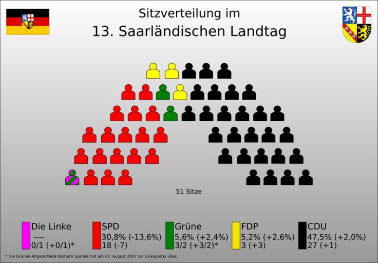 | Keywords: Landtag Saarland 13.svg Sitzverteilung des 13 Saarländischen Landtages Seatings in the 13<sup>th</sup> session of the Landtag state diet of Saarland Own 23 23 21 August 2009 UTC chris 論 Election apportionment diagrams of Landtag of Saarland Landtag Saarland 13 |