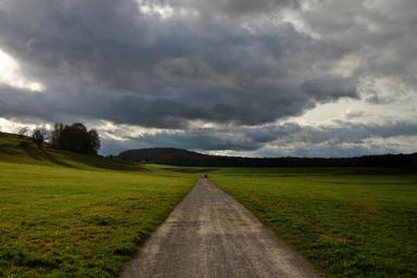 Keywords: lane weather rain forward rain clouds grey cloudiness away meadow clouds sky storm landscape sunlight light grass nature hill agriculture rural go for a walk straight direction mood southern germany germany baden württemberg