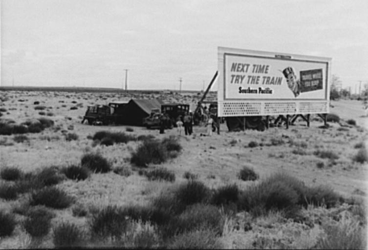 | Keywords: LangeNextTimeTryTheTrain.jpg Three families camped on the plains along U S 99 in California They are camped behind a billboard which serves as a partial windbreak All are in need of work 1938 Billboard reads Next Time Try The Train Southern Pacific Travel While You Sleep Photo by Dorothea Lange for Farm Security Administration/WPA via http //hdl loc gov/loc pnp/fsa 8b32636 1938-11 Creator Dorothea Lange PD-USGov Great Depression in the United States 1938 in California November 1938 Dorothea Lange Tents Homelessness in the United States Billboards in California U S Route 99 in California Southern Pacific Railroad Windbreak Kern County California Railway advertising |