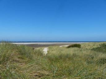Keywords: langeoog east frisia island coast north sea sea salt air beach sun bright blue sky partly cloudy wide